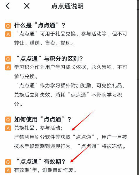 3、点击点点通说明,可查看注意事项及使用说明。要特别注意的是,不要恶意刷积分,积分1年未使用也会自动失效。