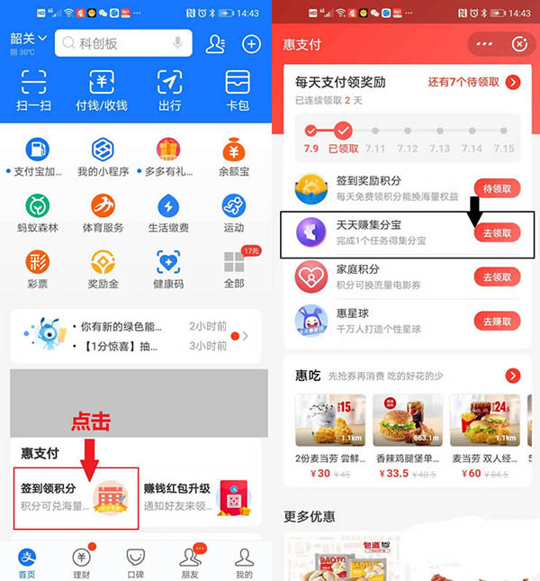 1、打开支付宝,点击签到领积分,打开了惠支付页面,在此页面点击“去领取”天天赚集分宝。