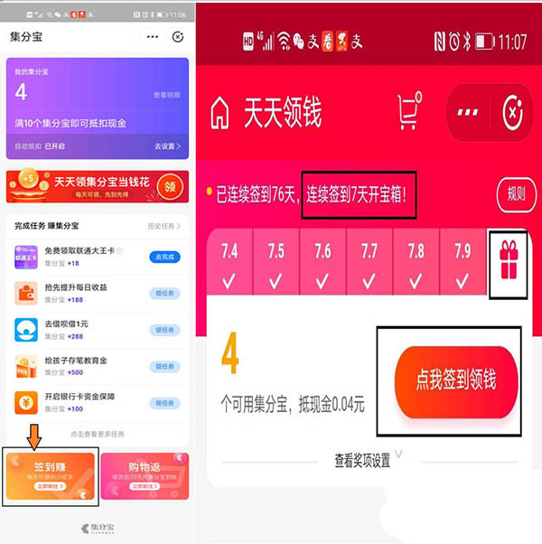 2、点击集分宝页面左下方的“签到赚”,在此页面可以每天签到领一个集分宝,连续签到7天有一次抽宝箱的机会。