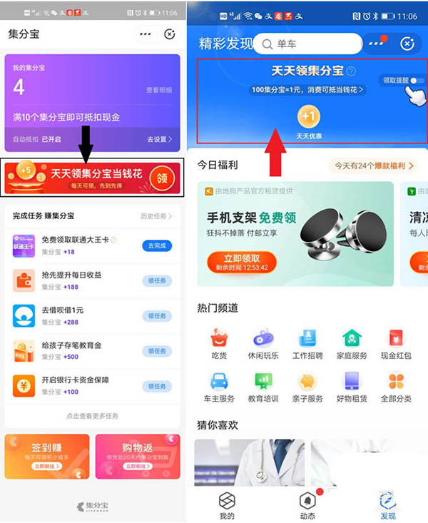 3、点击集分宝页面中“天天领集分宝当钱花”,如下图所示,在弹出的页面中有“+1”,点击“+1",则领取了一个集分宝。