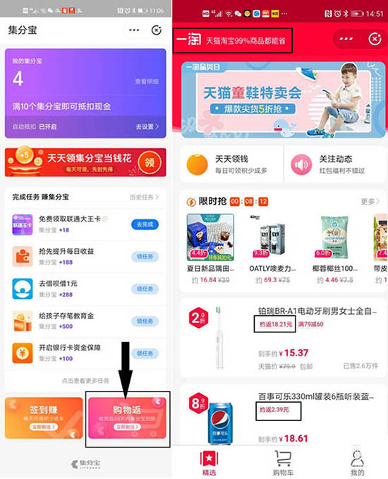 5、点击集分宝页面左下方的“购物返”,点击打开是“一淘”购物页面,通过“一淘”来购买淘宝、天猫的商品,成功签收后均可获得相应的集分宝。