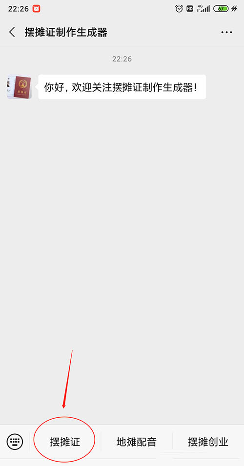 5、关注后会马上进入该公众号,点击下方的“摆摊证”。