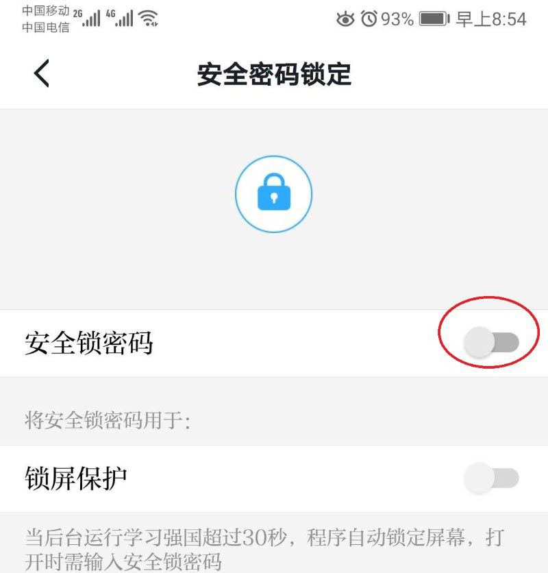 打开安全锁之后,待30秒后,需要输入密码才能打开学习强国