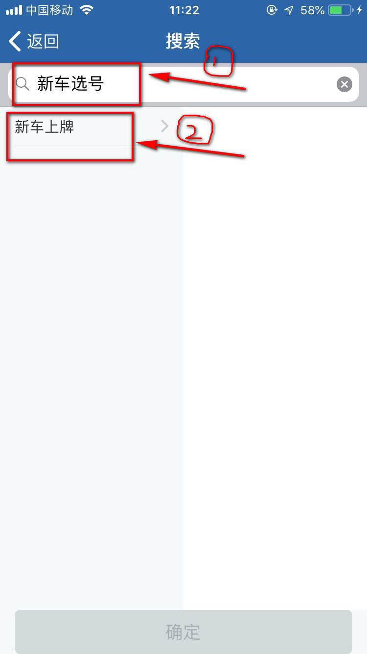 3、在弹出的页面输入“新车选号”然后在下方弹出的“新车上牌”字条处点击一下。