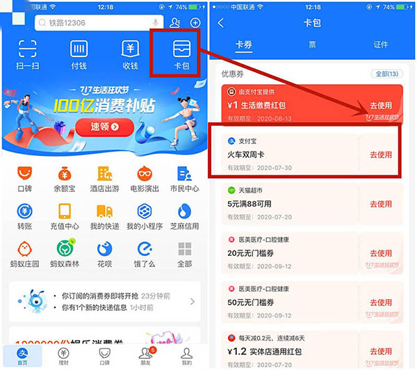 1、打开支付宝后,点击首页右上角的卡包,找到火车双周卡后的去使用选项。