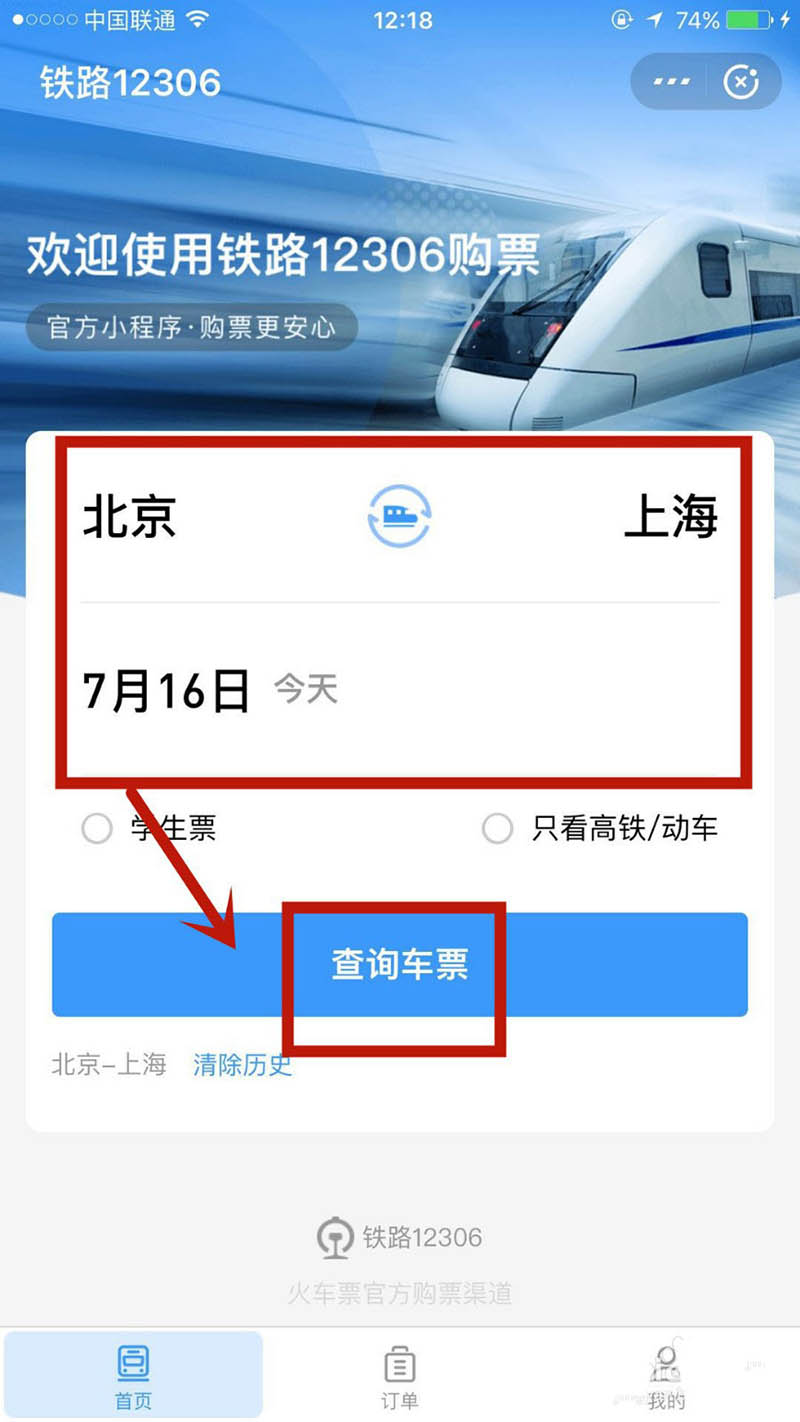 3、输入出发地跟到达地,出发时间后点击查询车票。