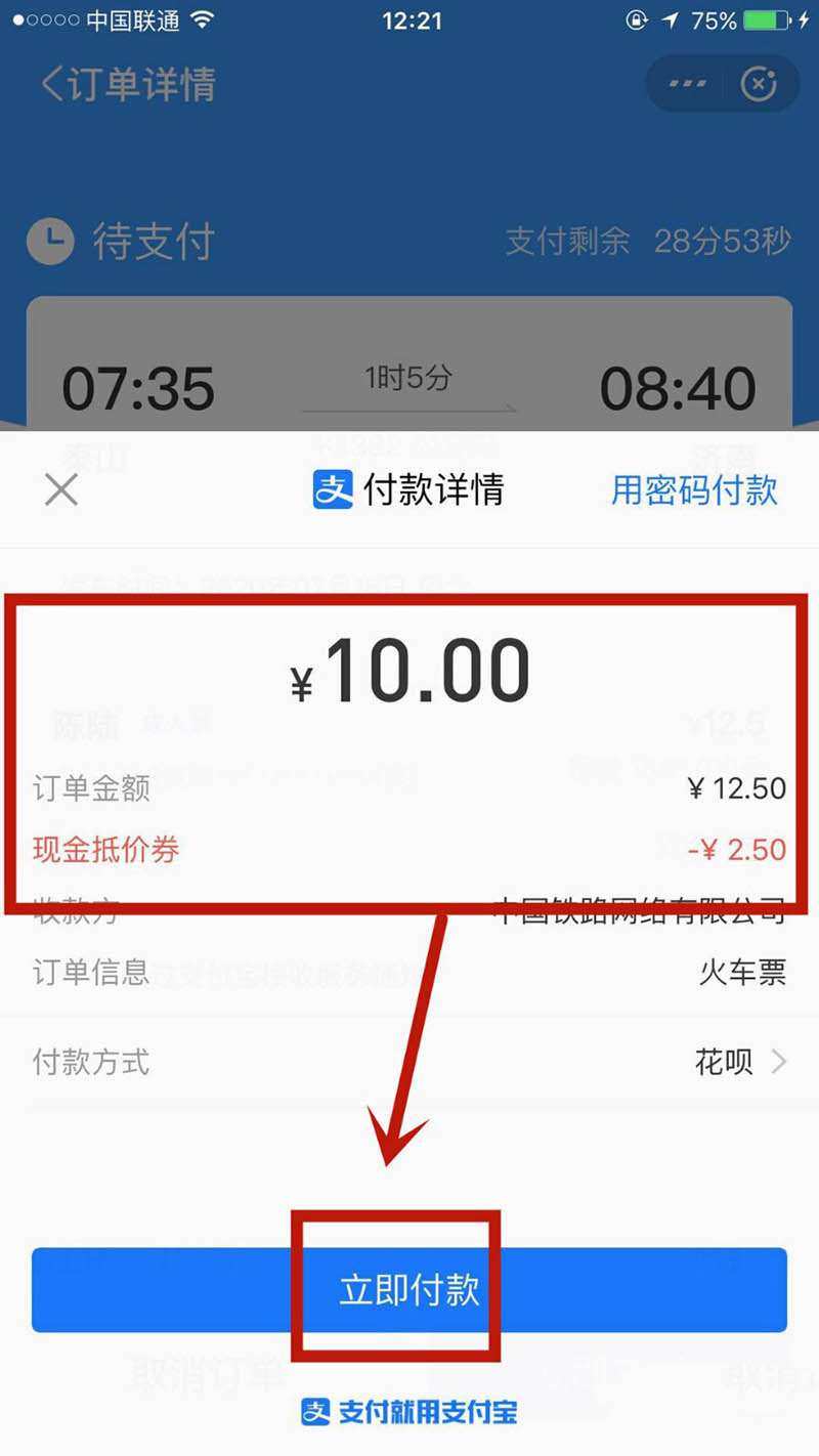 7、随后付款单上面会显示出票价是8折,点击立即付款即可。