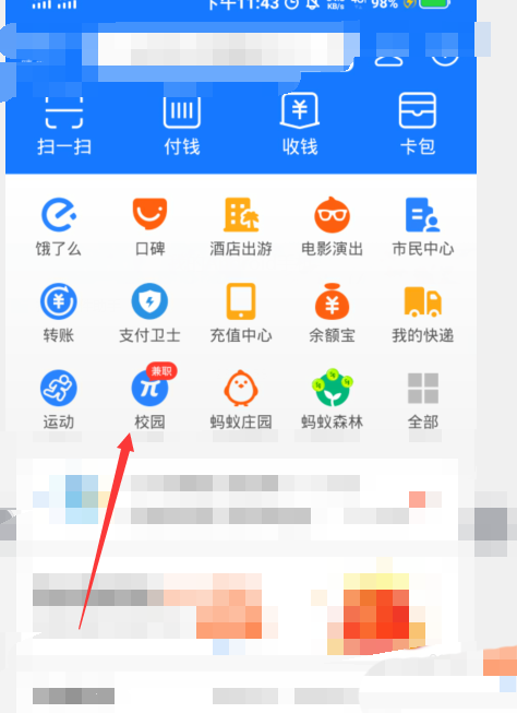 1、手机进入支付宝点击首页下面的【校园】标志选项。