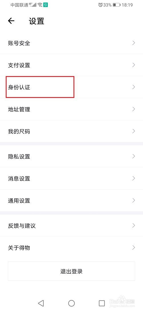 第二步进去得物设置之后,点击身份认证,如下图所示: