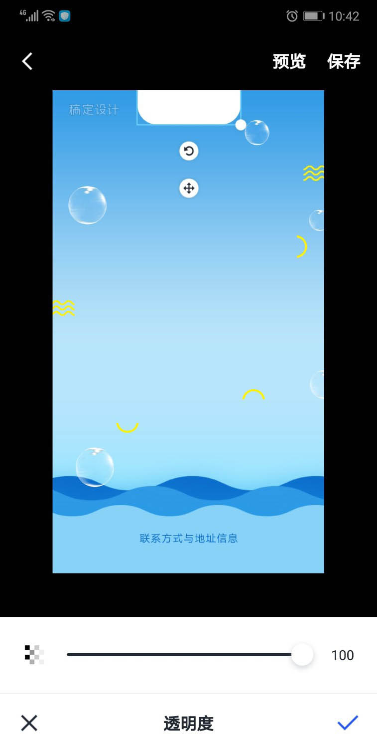 3、这一步,我们导入水滴的图片,设置为半透明的状态,我们复制多个水滴放在纯蓝色的背景上面,改变水滴的大小与位置。