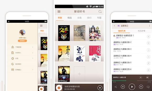 掌阅听书所有内容均属正版,仿真宫格书架一目了然,方便的书架功能,不论是在线播放还是本地播放,都能在书架中找到,并且能记住准确位置,下次直接连续播放。支持线控,播放/暂停一键切换,还可将线控音量键设为快进快退。
