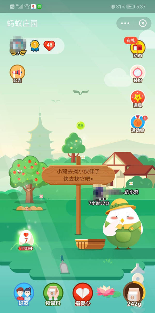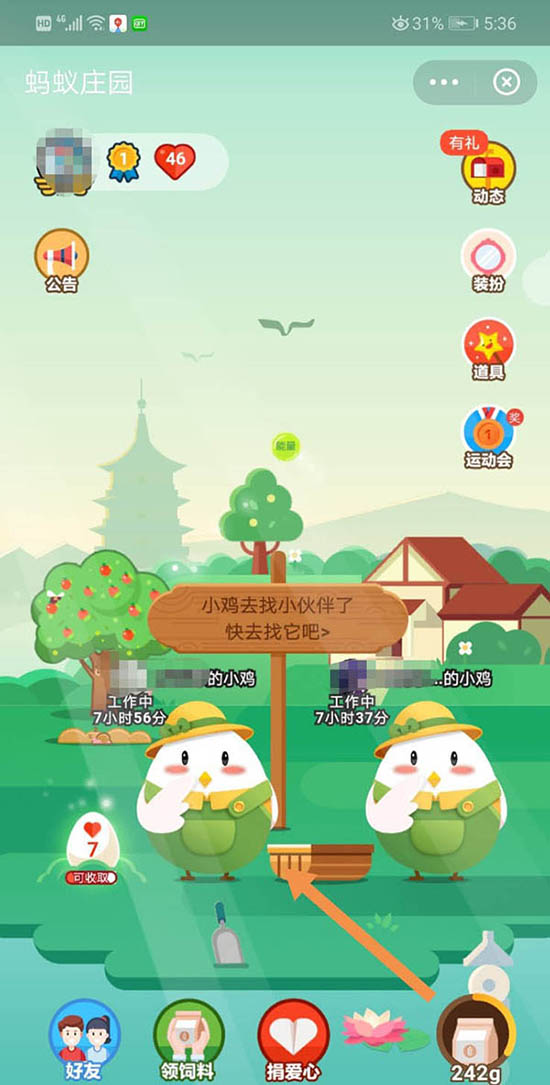 2、来到“蚂蚁庄园”,点击你雇佣的小鸡。