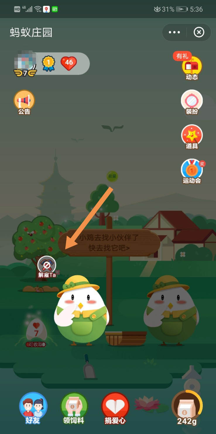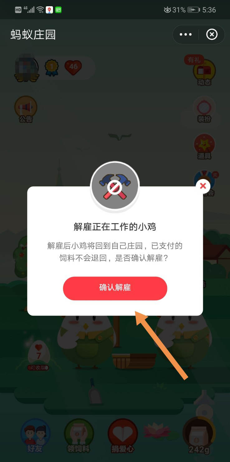 我们在玩蚂蚁庄园的时候,可能会雇佣好友的小鸡,有时候我们想解雇小鸡,该怎么操作呢?下面我来介绍一下。