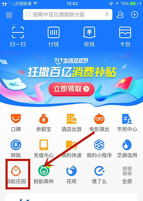 1、进入支付宝首页,点击蚂蚁庄园。