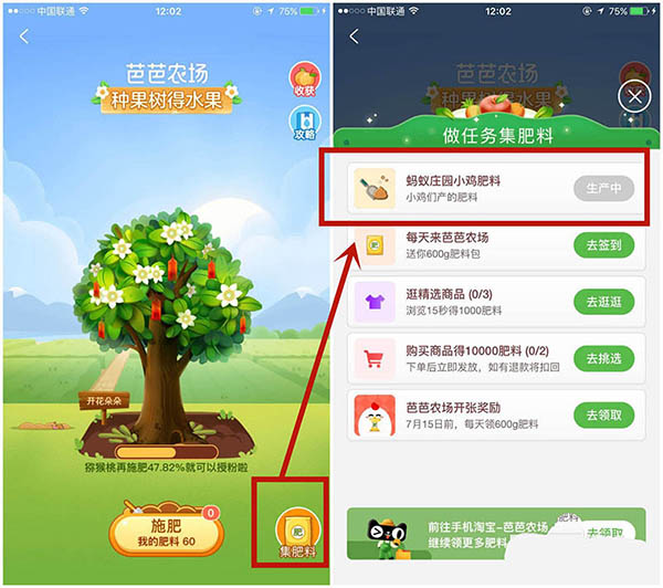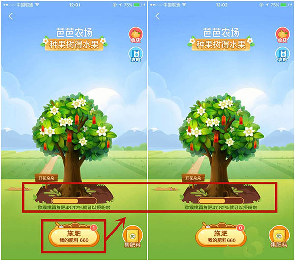 5、进入果树页面后,点击施肥,即可发现自己的果树成长进度条会加快一点。