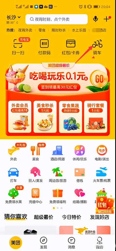 1、首先要说明的是,美团的共享电动车需要通过美团app软件扫码使用,所以要先在手机里下载安装美团app软件。安装完后,打开美团软件,在首页顶部有个“骑车”的图标。