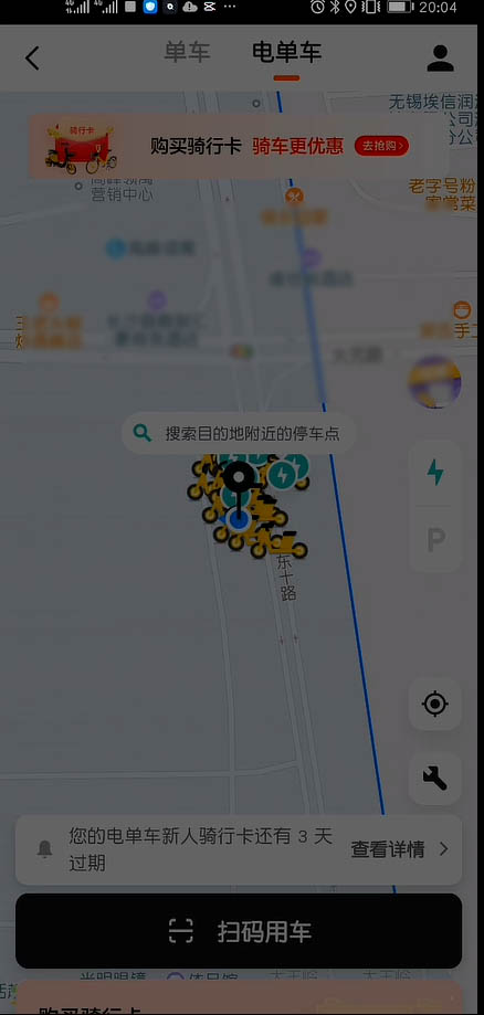 2、默认打开的是电单车的地图页面,在当前地图上黄色的车标都是附近美团电动车所在位置,我们可以根据地图上电车的位置找到它骑行。