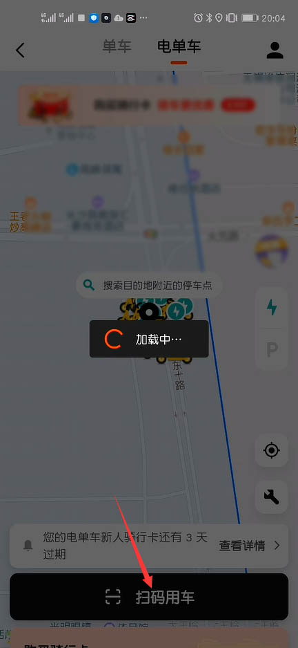 3、找到美团共享电单车(电动车),掏出手机点击“扫码用车”按钮,请扫一下共享电车上二维码。
