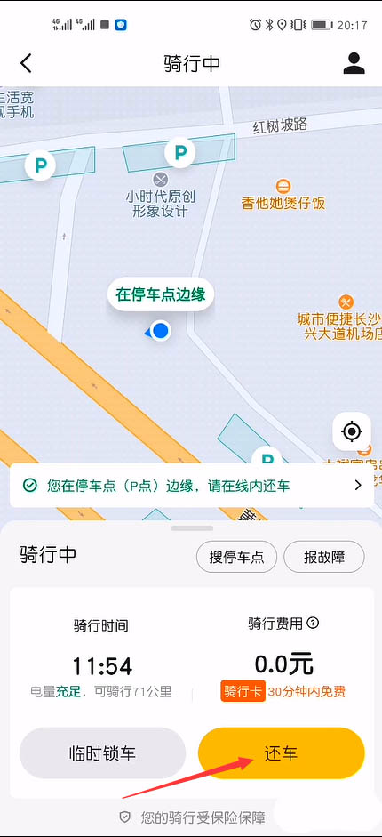 7、骑行结束后,请把电车骑到地图上指定的停车点还车。拿出手机,在美团app软件里点击“还车”按钮,在该页面我们可以看到骑行费用为0元,骑行时间为11分55秒。