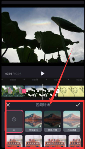7、点击后即可在下方弹出的视频转场中选择你喜欢的转场了。