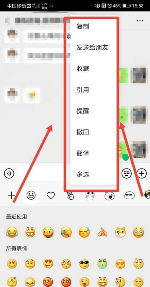 5、向好友发送信息,然后在2分钟内长按消息,即会弹出功能框,包含撤回、引用等功能,但老版本中的删除功能已经不见了,详情如下: