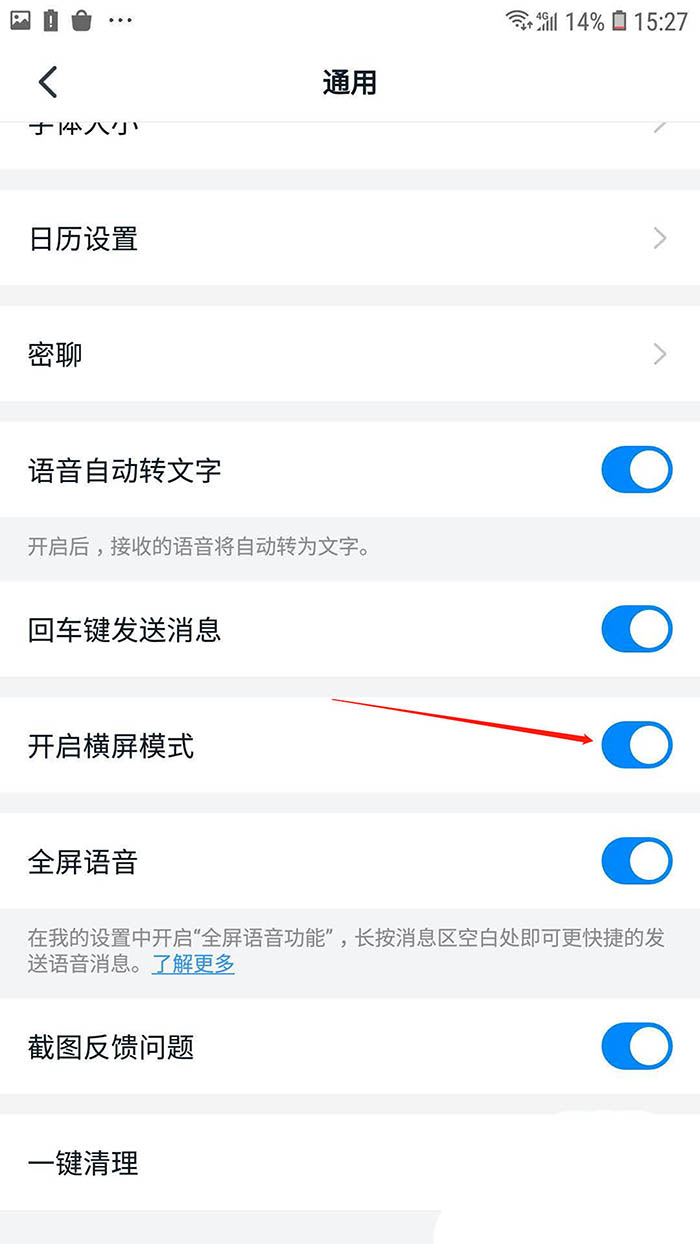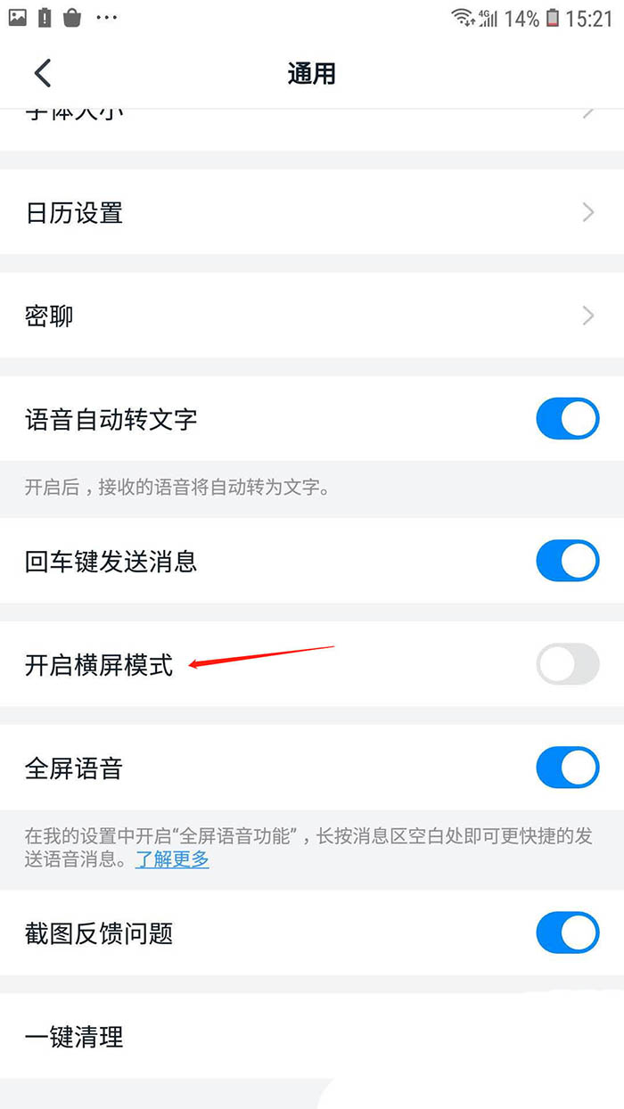 4、进入通用页面后,找到开启横屏模式选项;
