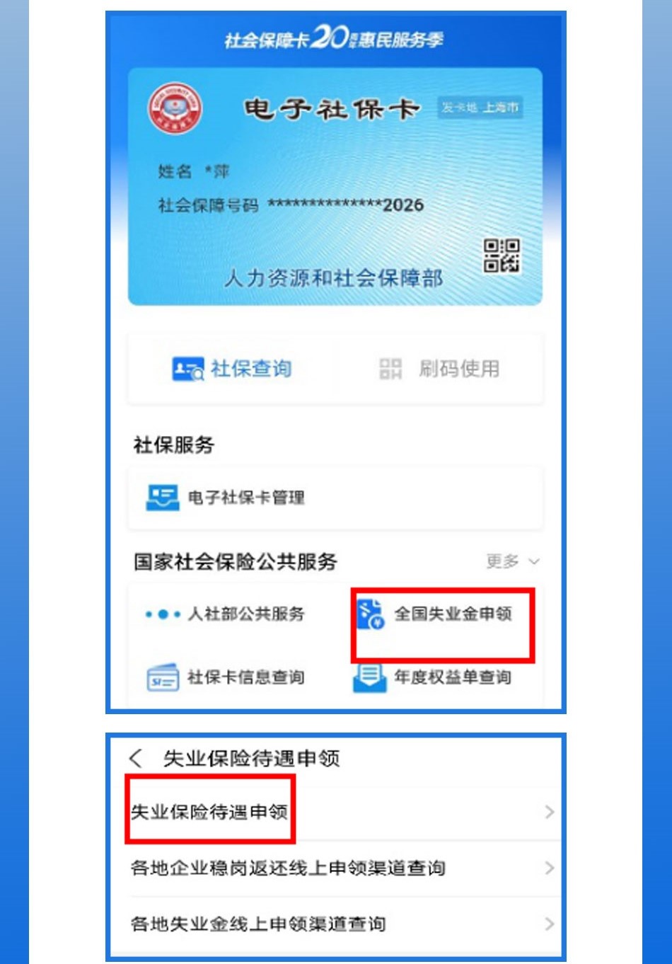 打开支付宝-卡保内找到电子社保卡-失业金申领
