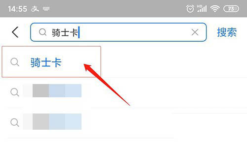 1、打开支付宝后,点击首页顶部的搜索框,并输入骑士卡后,在智能检索出的搜索词中点击第一项“骑士卡”。