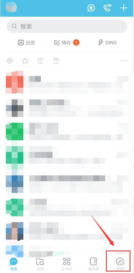 2、打开钉钉后,点击发现图标按钮(如图所示是)