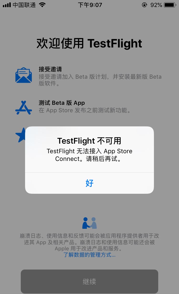 其实是因为苹果官方对TF签名分发的地域进行了限制,有些地区用户是正常的,有些地区的用户就会收到上面的提示。