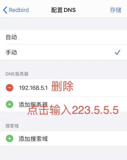 3、选择手动, 删除原来的DNS,添加新服务器223.5.5.5