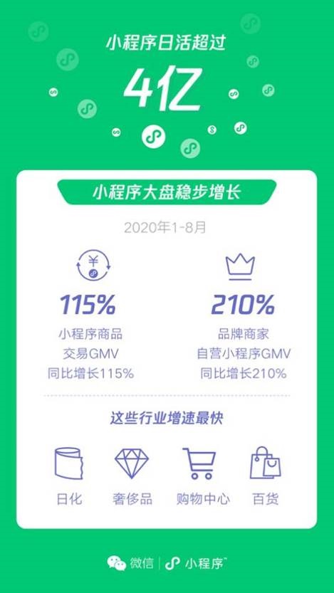 微信团队透露,截止到今年 8 月,小程序大盘稳步增长,小程序商品交易 GMV 同比增长 115%,品牌商家自营 GMV 同比增长 210%。其中,增长最快的行业为日化、奢侈品、购物中心和百货。