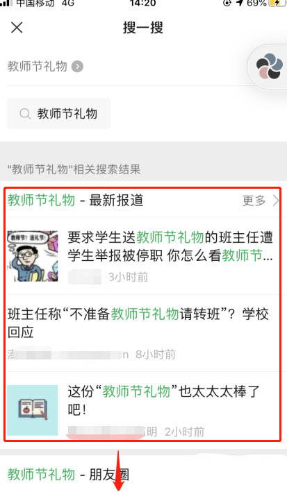 5、可以搜到相关内容,可以看到关于此关键词最近的报道,往下拉会有跟多的信息,比如朋友圈发过的内容,或者其他平台含有关键词的
