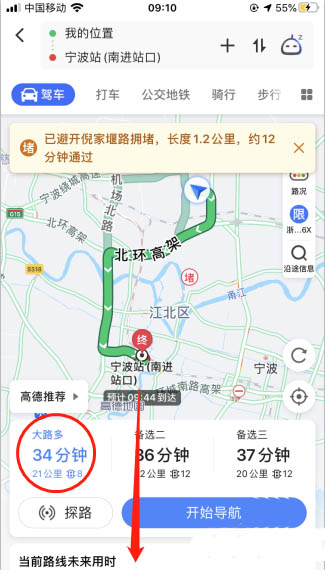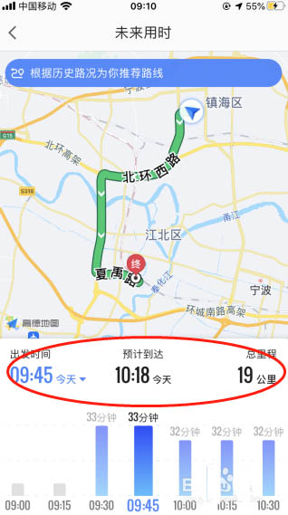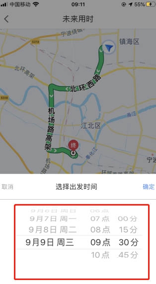 3、我们可以看到现在出发需要多少时间,屏幕往下拉,有一个未来用时