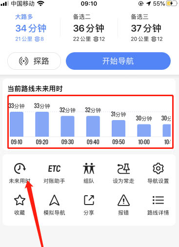 4、看到当先路线只有之后几个小时花费的时间,我们点击【未来用时】