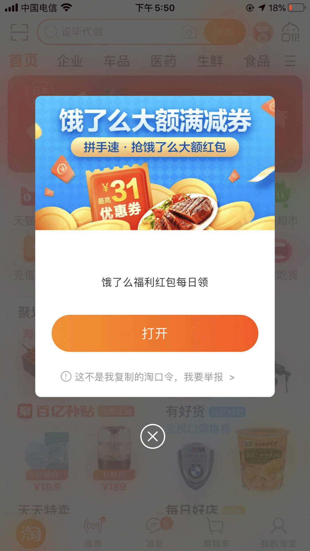 第一步保存饿了么红包兑换码【$ZTGc1LGdbwH$】,可以放在备忘录里或者微信里每天复制到【淘宝】里使用,效果如下图: