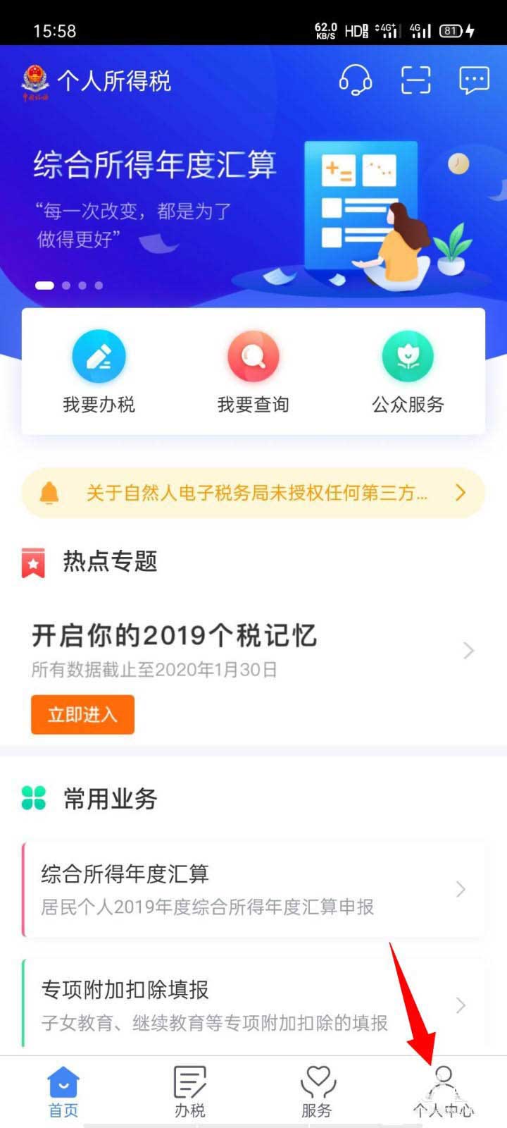 2、接下来,我们在个人所得税首页中,点击右下方的【个人中心】。