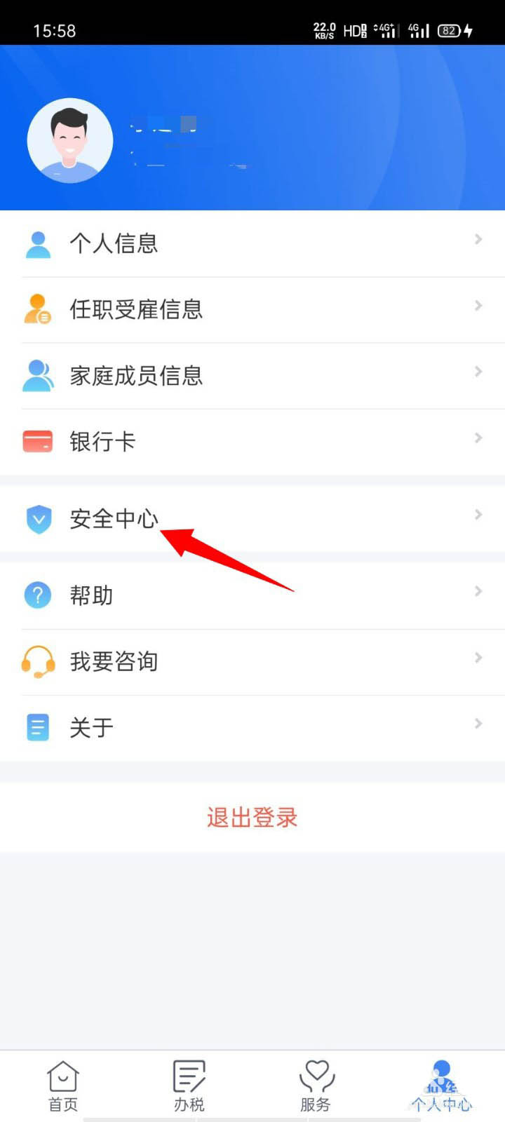3、下一步,我们在个人中心页面中,点击【安全中心】。