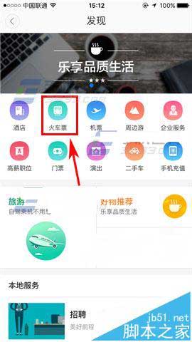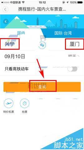 3)打开发现后我们再点击【火车票】,随后输入你的所在地名和要去的地名,选择日期后点击【查询】。(如下图)