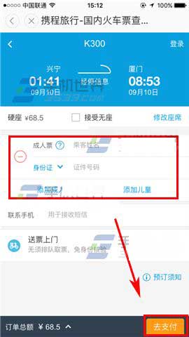 4)随后就会弹出火车票信息了,挑选你的座位后点击【预定】,最后输入你的姓名和身份证号点击【支付】就可以了,如需购买多人票,可点击添加成人(儿童)即可购买。(如下图)