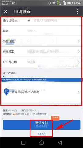 5、填写续签的相关信息后点击【微信支付/现金支付】即可支付完成续签。(如下图)