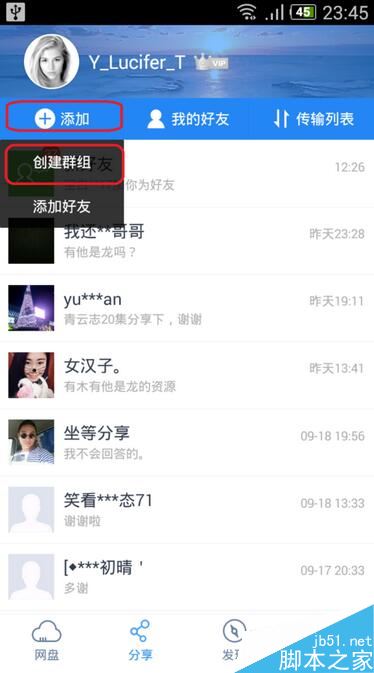 进入“分享”页面,这里可以看到自己的好友的对话,可以点击页面上部的“我的好友”查看、添加好友,建立群。