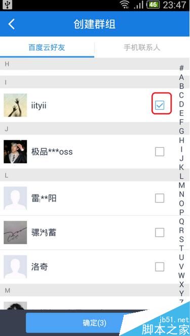 进入选择好友的也面,找到需要邀请进群的好友,点击勾选好友后面的小框,选择完成好,点击页面底部的“确定”
