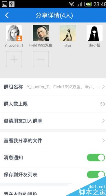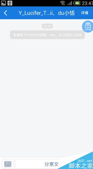 一个群就建立好了,点击页面底下的分享可以选择自己的文件分享给群里的好友;点击左下方的键盘图标,可以与好友聊天;点击页面上的“文件库”可以查看群里的文件。