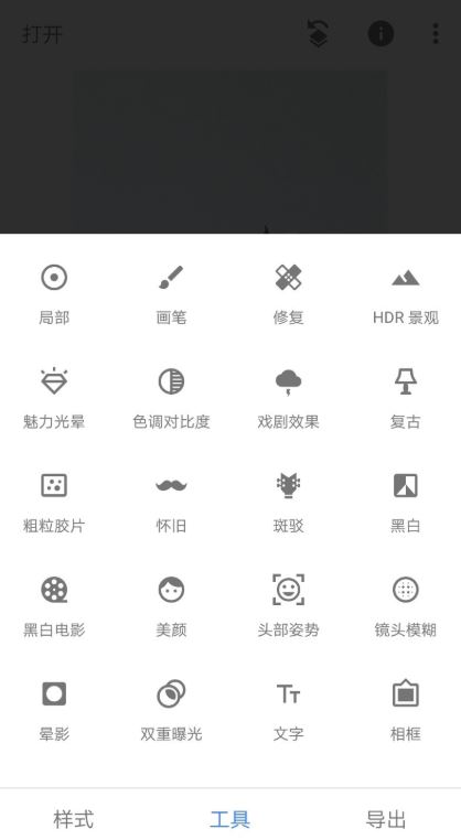 在手机中打开snapseed软件,导入素材图片,点击屏幕下方的工具,从菜单中选择双重曝光选项。