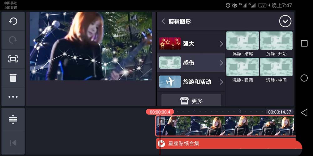 4、选择视频轨道,选择剪辑图形,接着选择伤感,并选择沉静-中间效果。