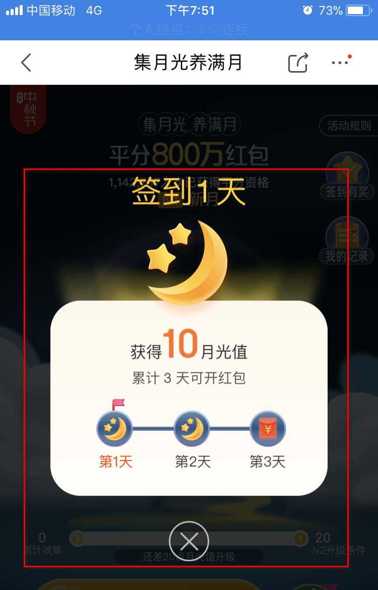 3、首先点击签到按钮,可以看到,成功签到,获得10月光值,且累计3天可得红包,这是额外奖励。