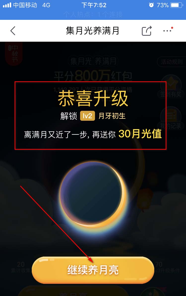 7、然后点击下【养月亮】按钮,当月光量达到升级要求后,会提示升级了,然后可以继续养月亮了。
