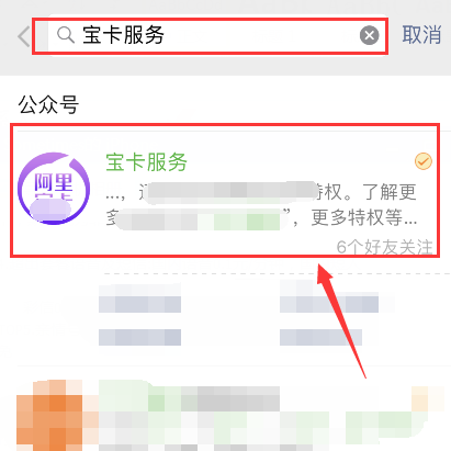 3、在最上端搜索空白处输入“宝卡服务”后搜索,可查询到“宝卡服务”公众号;