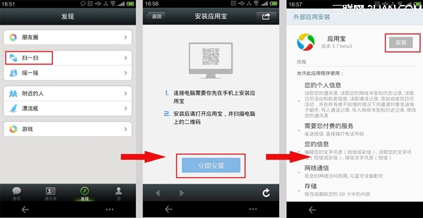 2、用手机扫描电脑上的二维码下载应用宝完整版。以微信为例:打开微信“扫一扫”扫描电脑上的二维码成功后点击“立即安装”即可下载应用宝完整版到手机上安装。